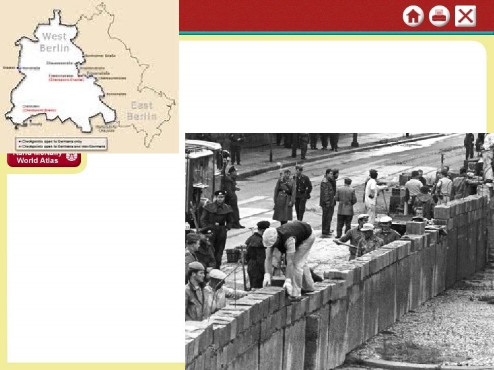 Crisis over Berlin SECTION 1 The Berlin Crisis • By 1961 20% of Germans flee to West Berlin; economic drain on East • Khrushchev wants to close access roads to West Berlin; JFK refuses • Soviets isolate West Berlin from East Germany with Berlin Wall • SHOW BERLIN WALL VLA: (die roll details Image Searching for Ways to Ease Tensions • Khrushchev, Kennedy • Establish hot line—direct phone between White House, Kremlin • Limited Test Ban Treaty bans nuclear tests in atmosphere NEXT
