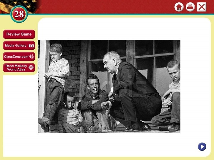 SECTION 2 continued The Promise of Progress Race to the Moon Image • April 1961, Soviet cosmonaut Yuri A. Gagarin is first man in space • Soon after, U. S. puts man in space, uses satellite communications • July 1969 U. S astronaut Neil Armstrong is first man to walk on moon • University science programs grow; new industries, technologies arise Addressing Domestic Problems • Michael Harrington’s The Other America brings attention to poverty • 1963, JFK begins to work on poverty, racial injustice, civil rights NEXT