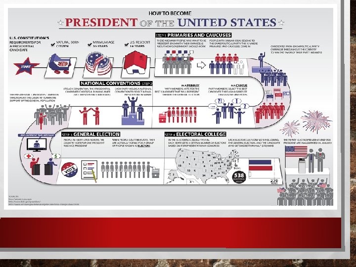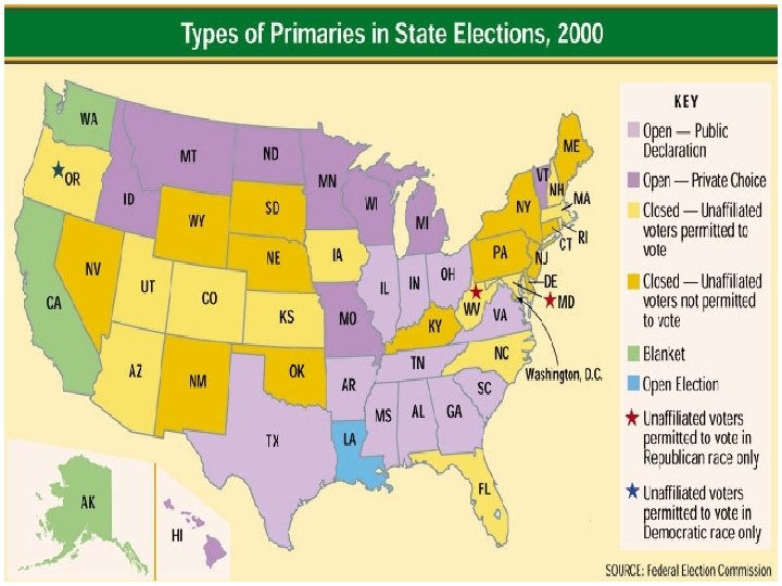 CLOSED VS OPEN PRIMARY • ARGUMENTS IN FAVOR OF A CLOSED PRIMARY • IT PREVENTS ONE PARTY FROM “RAIDING” THE OTHER PRIMARY IN HOPES OF NOMINATING A WEAKER CANDIDATE • IT HELPS MAKE CANDIDATES MORE RESPONSIVE TO THE PLATFORM (IT’S MEMBERS) • MAKES VOTERS MORE THOUGHTFUL B/C THEY HAVE TO IDENTIFY WITH A PARTY IN ORDER TO VOTE • ARGUMENTS AGAINST A CLOSED PRIMARY • IT COMPROMISES THE SECRECY OF THE BALLOT BECAUSE VOTERS HAVE TO IDENTIFY WITH A PARTICULAR PARTY • IT EXCLUDES INDEPENDENT VOTERS FROM THE VOTING PROCESS