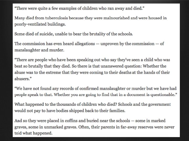 Police Discrimination • In the Pas in 1971, Aboriginal youth were routinely stopped by police without cause (and the same harassment was not experienced by white students) • Police heard stories about white men throwing Aboriginal men off the bridge into the Saskatchewan River; but the stories were never investigated • Police were aware of white youths cruising the town, picking up Aboriginal girls for drinking parties and sex; the police did not stop cars to see if the girls were of age or if they were going willingly, nor did they address it with members of white community or warn members of Aboriginal community, nor did they raise it with the host families of Aboriginal students and Dept of Indian Affairs who were responsible for the care of Aboriginal students • The RCMP failed to check the Colgan car properly in their investigation