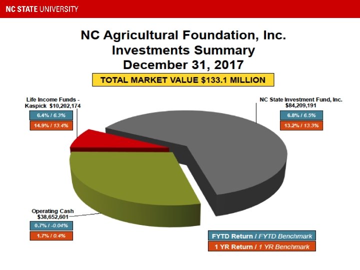 Asset Management Endowment contributions are managed by the UNC Management Company, which manages endowments for the public universities in NC. Endowments are invested with the NC State Investment Fund, Inc. , which realized a net investment return of 6. 8% for the fiscal year-to-date as compared to the benchmark of 6. 5%. The one-year performance, also as of December 31, was 13. 2% as compared to the benchmark of 13. 3%. Results of the 2017 NACUBO (National Association of College and University Business Officers) - Commonfund Endowment Survey - NC State University and associated entities (including the Ag and Tobacco Foundations) ranked 94 out of 809 respondents with a combined endowment market value of $1. 12 billion at June 30, 2017. NC State reported a combined return to NACUBO of 12. 1%.