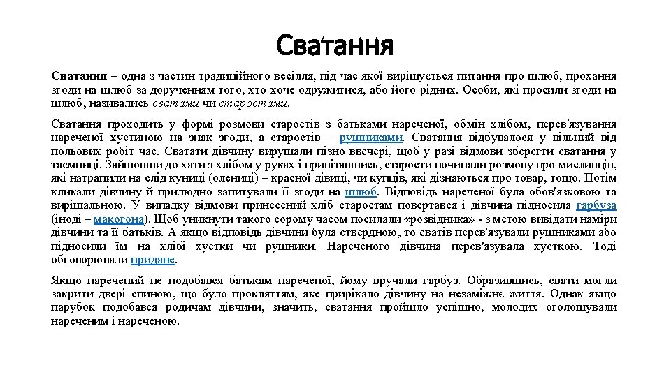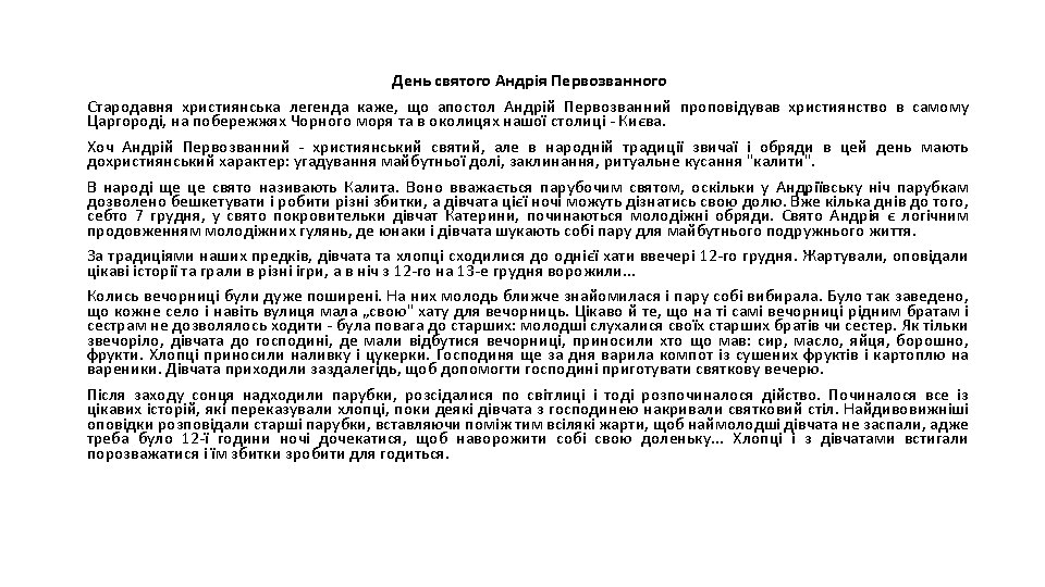 In order to illustrate the notion of context of situation, Malinowski described a typical Trobriand fishing expedition: after the islanders had gone outside the lagoon into the open sea to fish, they had to navigate a difficult course through the reefs to get back to the lagoon. For this reason, people on the shore shouted instructions to the fishermen and the whole situation became a sort of competition between the different canoes and groups of people. The language used in such situations was full of technical terms, references to surroundings and indications of change, based on types of behaviour well-known to the participants. The linguistic material used was, therefore, inextricably dependent upon the course of the activity in which the utterances were embedded. It was language in action and the message was clear only to those who knew what was going on. For this reason when he accounted for these situations he realised that it was necessary to provide not only a description of what was happening, the situation, but also of the total cultural background, because: …involved in any kind of linguistic interaction, in any kind of conversational exchange, were not only the immediate sights and sounds surrounding the event but also the whole cultural history behind the participants, and behind the kind of practices they were engaging in, determining their significance for the culture, whether practical or ritual. All these played a part in the interpretation of meaning. (Halliday, 1985) Here, Halliday refers to the notion of the context of culture, which together with the context of situation is necessary for the understanding of the text. French window, Beefeaters, black pudding, 10 Downing St. , Jack-o-Lantern, Child free zone, grammar school, Oktoberfest, інтернат, СМТ, коледж, кандидат наук, кутя Task: give your examples of English/Ukrainian words/word combinations that can be understood only with consideration of culture context