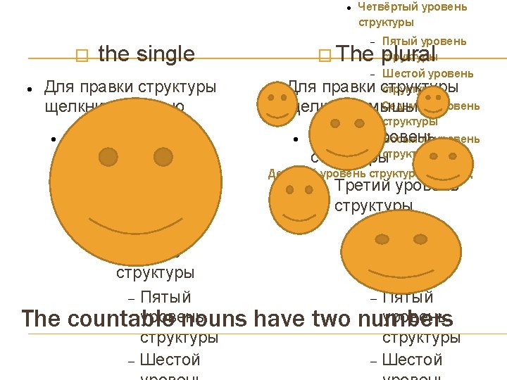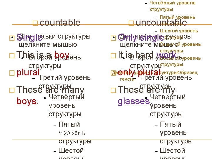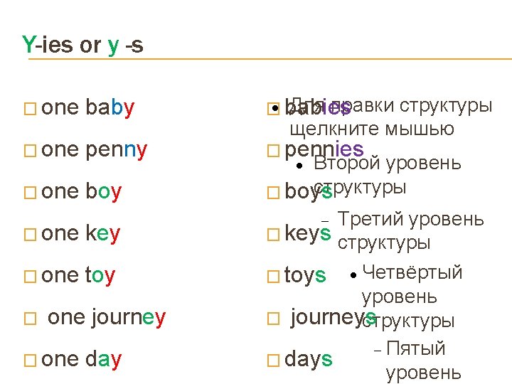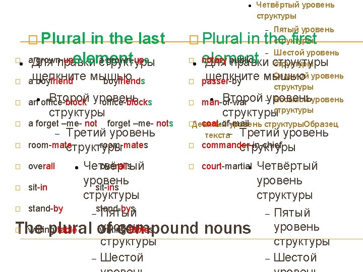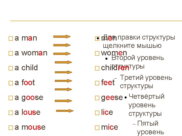 Try to guess � one cactus � � one antenna � � one curriculum � � one Index � уровень структуры indices � one appendix � appendices Третий � one basis � bases � phenomena � one phenomenon � a grown-up � � a father-in law � � his –in law � cacti Для правки структуры antennae щелкните мышью curricula Второй уровень структуры Четвёртый уровень grown-ups структуры fathers-in law Пятый his –in laws уровень