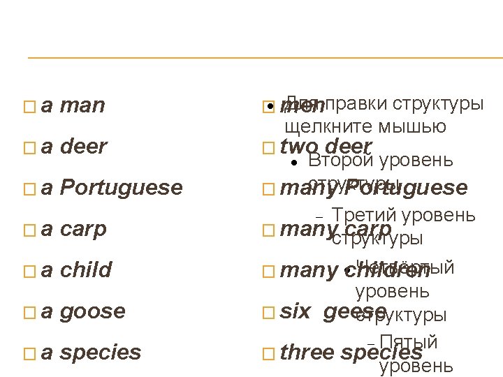 Identical forms for the singular and for the plural � a deer � � a species � структуры щелкните two species мышью � a means � Второй some means � a carp � уровень структуры Five carp � a sheep � five sheep � a series � three series two deer Для правки Третий уровень структуры Четвёртый six fish but lots of kind of уровень fishes структуры Two pike Пятый four salmon уровень � a fish � a pike � � � a salmon �