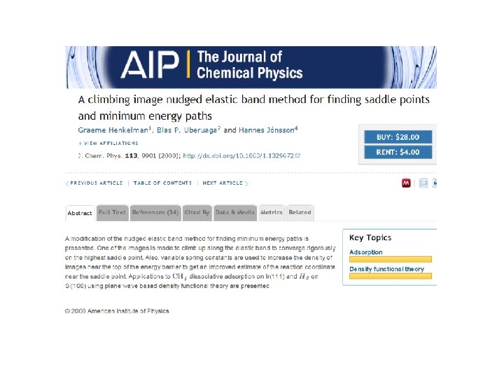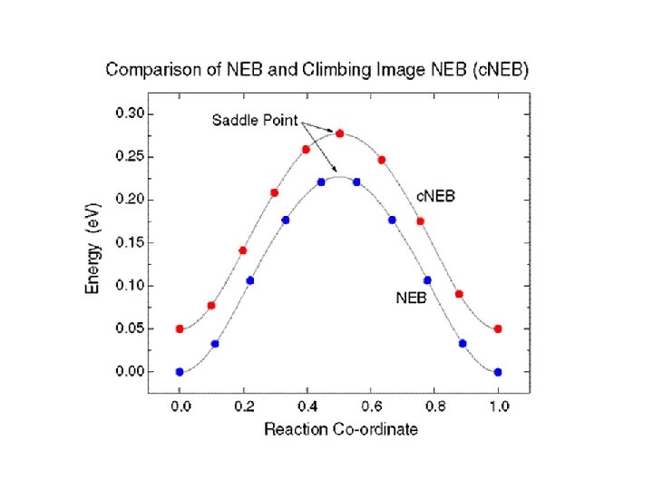 CI-NEB • The highest energy image is driven up to the saddle point. • This image does not feel the spring forces along the band. • True force at this image along the tangent is inverted. • Image tries to maximize it's energy along the band, and minimize in all other directions. • When this image converges, it will be at the exact saddle point.
