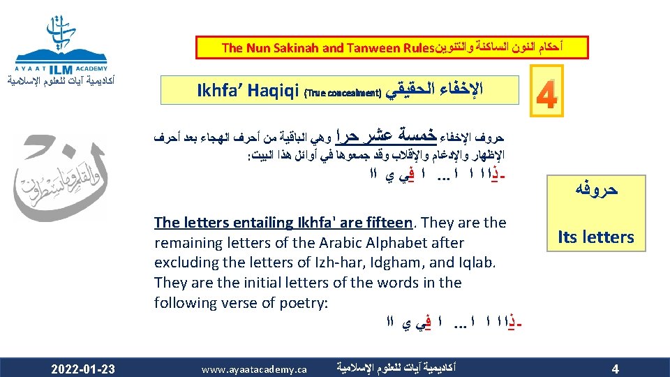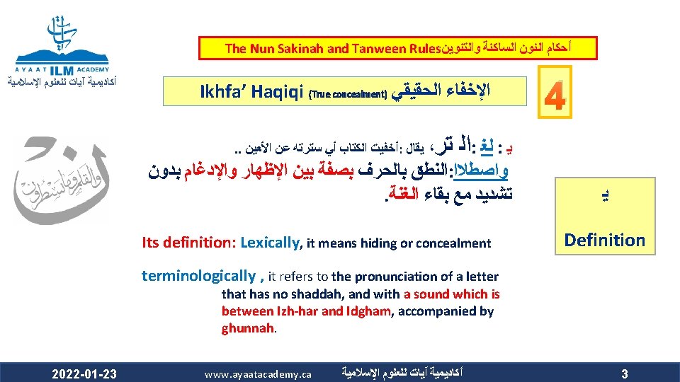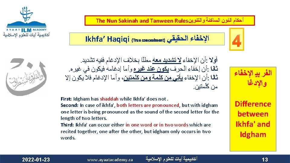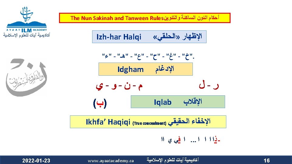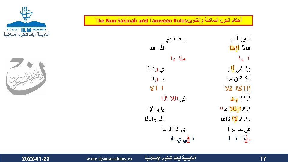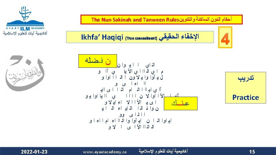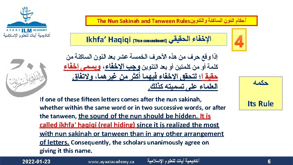 The Nun Sakinah and Tanween Rules ﺃﺤﻜﺎﻡ ﺍﻟﻨﻮﻥ ﺍﻟﺴﺎﻛﻨﺔ ﻭﺍﻟﺘﻨﻮﻳﻦ ﺃﻜﺎﺩﻳﻤﻴﺔ آﻴﺎﺕ ﻟﻠﻌﻠﻮﻡ ﺍﻹﺳﻼﻣﻴﺔ Ikhfa’ Haqiqi (True concealment) ﺍﻹﺧﻔﺎﺀ ﺍﻟﺤﻘﻴﻘﻲ ﻫﻮ ﺃﻦ ﺍﻟﻨﻮﻥ ﺍﻟﺴﺎﻛﻨﺔ ﻭﺍﻟﺘﻨﻮﻳﻦ ﻟﻢ ﻳﻘﺘﺮﺏ ﻣﺨﺮﺟﻬﻤﺎ ﻣﻦ ﻣﺨﺮﺝ ﻭﻟﻢ ﻳﺒﻌﺪ ، ﺍﻟﺤﺮﻭﻑ ﺍﻟﻤﺬﻛﻮﺭﺓ ﻛﻘﺮﺑﻪ ﻣﻦ ﻣﺨﺮﺝ ﺣﺮﻭﻑ ﺍﻹﺩﻏﺎﻡ ﻓﻴﺪﻏﻤﺎ ﻣﺨﺮﺟﻬﻤﺎ ﻋﻦ ﻣﺨﺮﺝ ﻫﺬﻩ ﺍﻷﺤﺮﻑ ﻛﺒﻌﺪﻩ ﻋﻦ ﻣﺨﺮﺝ ﺣﺮﻭﻑ ﺍﻹﻇﻬﺎﺭ . ﻓﺍ ﺣﻜﺍ ﻣﺘﻮﺳﺍ ﺑﻴﻦ ﺍﻹﻇﻬﺎﺭ ﻭﺍﻹﺩﻏﺎﻡ ، ﻓﻴﻈﻬﺮﺍ The makhraj of both the nun sakinah and tanween is not as near the makhraj of the above mentioned letters as the idgham letters are, which prevents them from being mudgham (merged). On the other hand, their makhraj (of the nun sakinah and tanween) is not as far from the makhraj of the abovementioned letters as it is from that of the izhhar letters, which prevents them from being muzh-har (pronounced clearly). Accordingly, their ruling is that they are to be pronounced between Izh-har and Idgham. 2022 -01 -23 www. ayaatacademy. ca ﺃﻜﺎﺩﻳﻤﻴﺔ آﻴﺎﺕ ﻟﻠﻌﻠﻮﻡ ﺍﻹﺳﻼﻣﻴﺔ 4 ﺳﺒﺒﻪ Its Reason 5