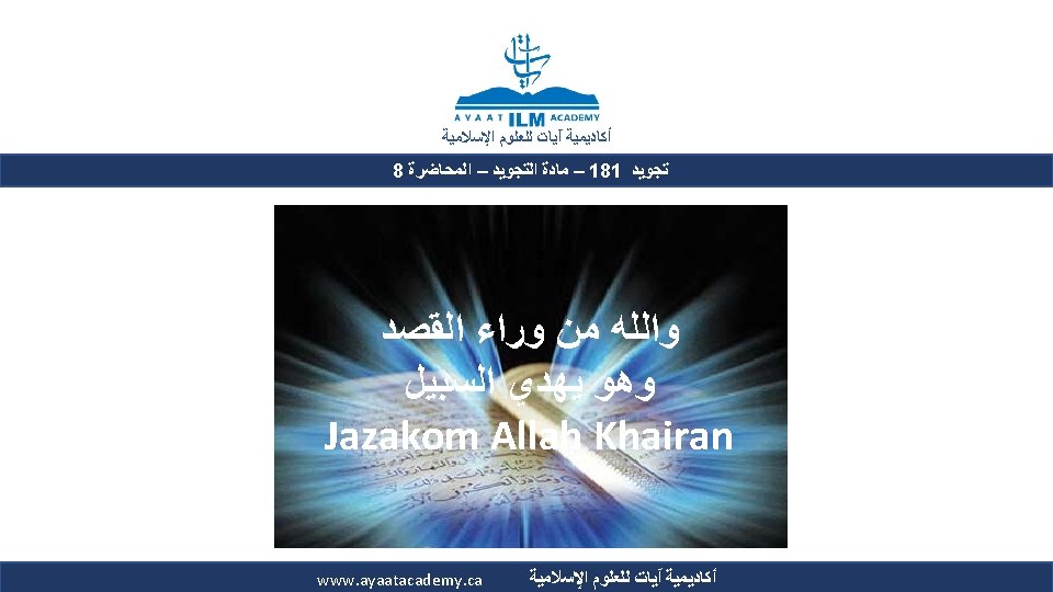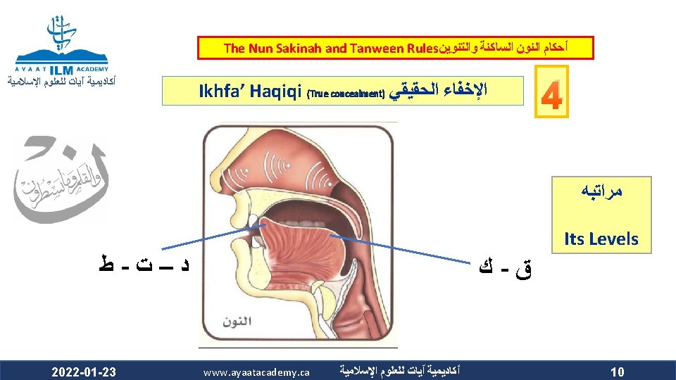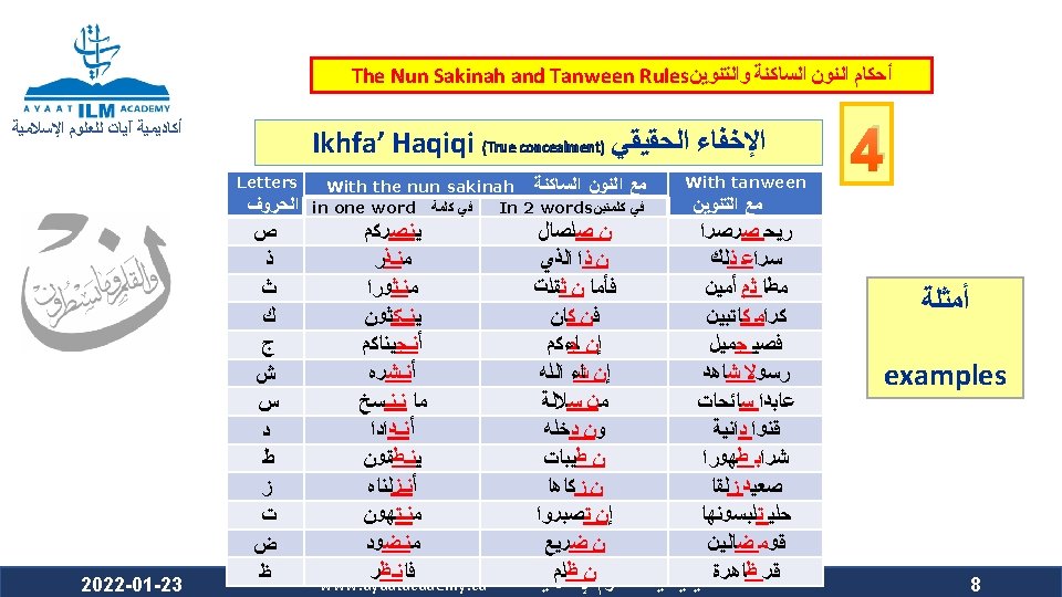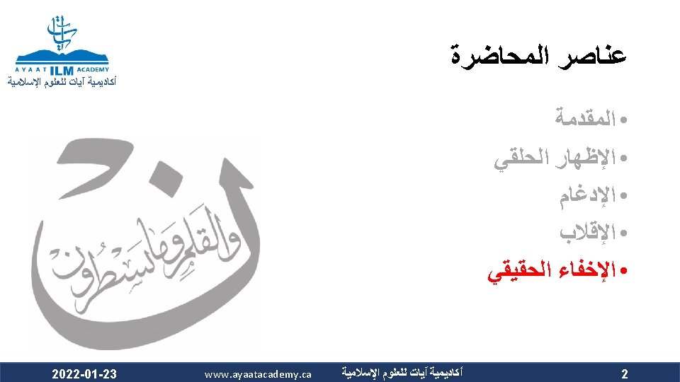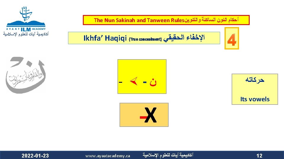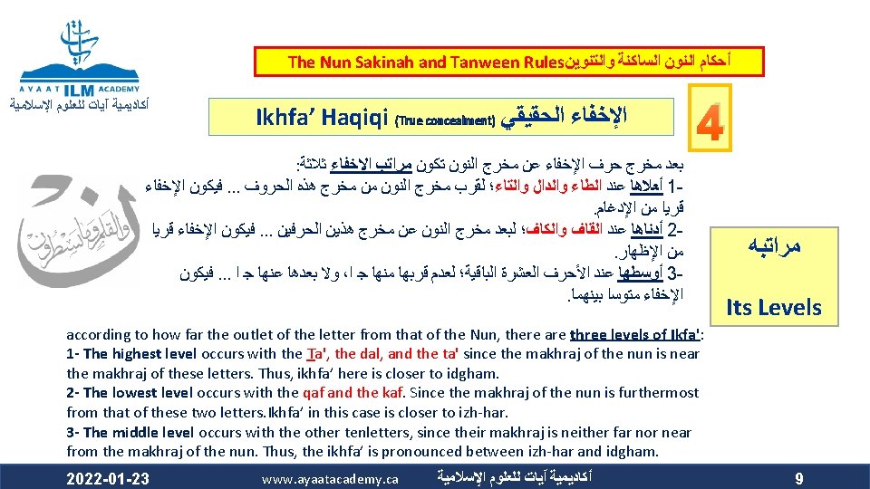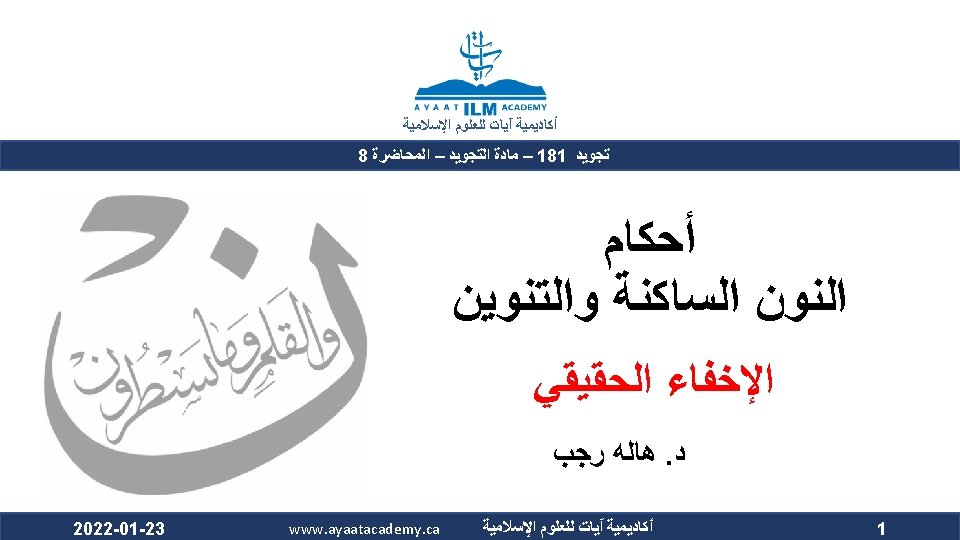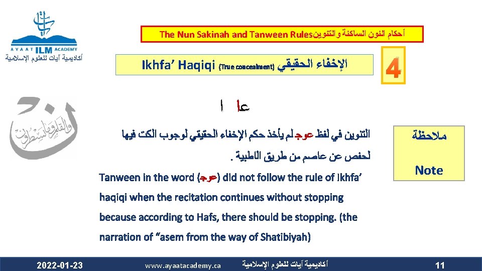 The Nun Sakinah and Tanween Rules ﺃﺤﻜﺎﻡ ﺍﻟﻨﻮﻥ ﺍﻟﺴﺎﻛﻨﺔ ﻭﺍﻟﺘﻨﻮﻳﻦ ﺃﻜﺎﺩﻳﻤﻴﺔ آﻴﺎﺕ ﻟﻠﻌﻠﻮﻡ ﺍﻹﺳﻼﻣﻴﺔ Ikhfa’ Haqiqi (True concealment) ﺍﻹﺧﻔﺎﺀ ﺍﻟﺤﻘﻴﻘﻲ ﻫﻮ ﺃﻦ ﺍﻟﻨﻮﻥ ﺍﻟﺴﺎﻛﻨﺔ ﻭﺍﻟﺘﻨﻮﻳﻦ ﻟﻢ ﻳﻘﺘﺮﺏ ﻣﺨﺮﺟﻬﻤﺎ ﻣﻦ ﻣﺨﺮﺝ ﻭﻟﻢ ﻳﺒﻌﺪ ، ﺍﻟﺤﺮﻭﻑ ﺍﻟﻤﺬﻛﻮﺭﺓ ﻛﻘﺮﺑﻪ ﻣﻦ ﻣﺨﺮﺝ ﺣﺮﻭﻑ ﺍﻹﺩﻏﺎﻡ ﻓﻴﺪﻏﻤﺎ ﻣﺨﺮﺟﻬﻤﺎ ﻋﻦ ﻣﺨﺮﺝ ﻫﺬﻩ ﺍﻷﺤﺮﻑ ﻛﺒﻌﺪﻩ ﻋﻦ ﻣﺨﺮﺝ ﺣﺮﻭﻑ ﺍﻹﻇﻬﺎﺭ . ﻓﺍ ﺣﻜﺍ ﻣﺘﻮﺳﺍ ﺑﻴﻦ ﺍﻹﻇﻬﺎﺭ ﻭﺍﻹﺩﻏﺎﻡ ، ﻓﻴﻈﻬﺮﺍ The makhraj of both the nun sakinah and tanween is not as near the makhraj of the above mentioned letters as the idgham letters are, which prevents them from being mudgham (merged). On the other hand, their makhraj (of the nun sakinah and tanween) is not as far from the makhraj of the abovementioned letters as it is from that of the izhhar letters, which prevents them from being muzh-har (pronounced clearly). Accordingly, their ruling is that they are to be pronounced between Izh-har and Idgham. 2022 -01 -23 www. ayaatacademy. ca ﺃﻜﺎﺩﻳﻤﻴﺔ آﻴﺎﺕ ﻟﻠﻌﻠﻮﻡ ﺍﻹﺳﻼﻣﻴﺔ 4 ﺳﺒﺒﻪ Its Reason 5