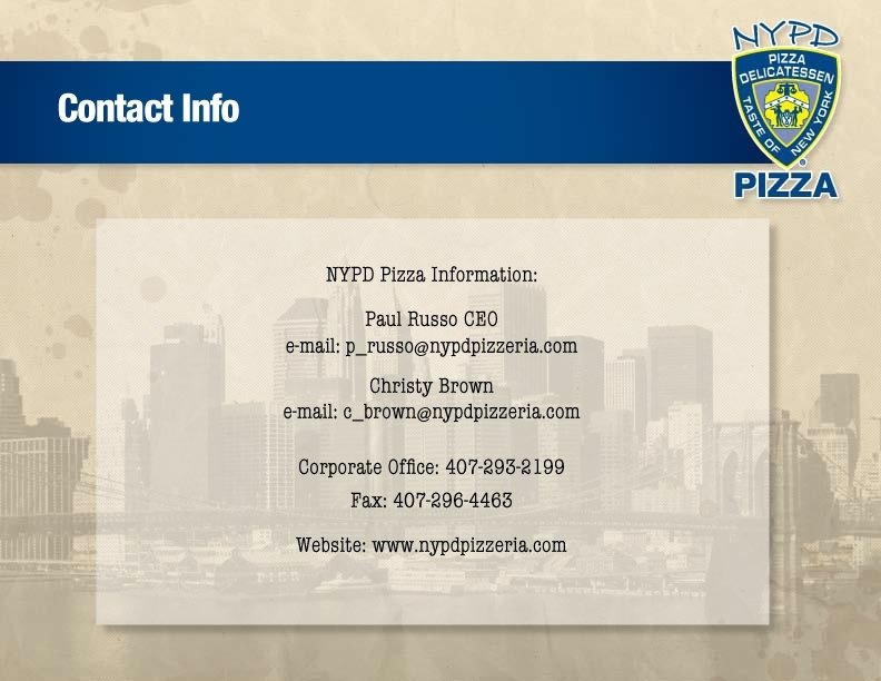 • Incentive: On top of the competitive success fee, the first Sunbelt consultant to complete a NYPD Pizza deal receives a 4 night vacation trip to Orlando for a family of 4! • Includes airfare, hotel and an all-expenses paid dinner one night at a NYPD Pizza store in the Orlando area.