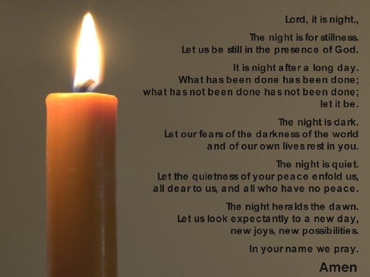 The offering of prayer late in the evening, often called Compline, has sometimes been described as the “goodnight prayer of the Church’. It rounds off the day and prepares us for a quiet night. As the psalmist wrote: I lie down in peace and take my rest for it is in God alone that I dwell unafraid. Night Prayer derives its content from the wisdom of the centuries in Scripture and above all in the psalms, but also from contemporary Christian experience of God. It celebrates the awareness that each of us who tries to pray is a part of the human whole.