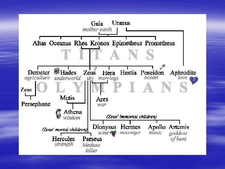 Eros (Cupid) -God of love -Son of Venus Lesser Gods -Constant Companion -Armed with bow and arrow shot darts of desire Cupid married Psyche Aphrodite was jealous of Psyche because she was so beautiful. The Fates The 9 Muses -The inspiration of poetry, music and dance -They were said to dance and sing at parties held by the gods and heroes. -Three goddesses sometimes called the daughters of night. -Clotho- the spinner of life Lachesis- apportioner (measures time for ea. mortal) Atropos- the inevitable (cuts the thread)