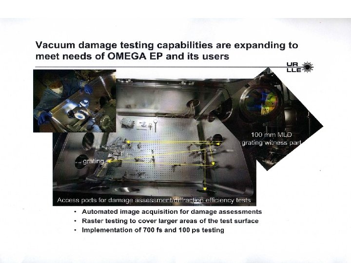 The Optical Materials Technology (OMT) group operates its own vacuum, short-pulse 1054 nm laser damage test facility Pulse compressor #2 Vacuum chamber Pulse compressor #1 Ti: Sapphire-based CPA system • 1054 nm ultrafast laser system provides tens of millijoules at a 0. 1 Hz repetition rate with a 0. 6 – 100 ps pulse width range • Vacuum vessel provides damage testing at 10 -6 Torr • High resolution imaging system supports damage observation in IR and visible light for dielectric high reflectors, beamsplitters and gratings
