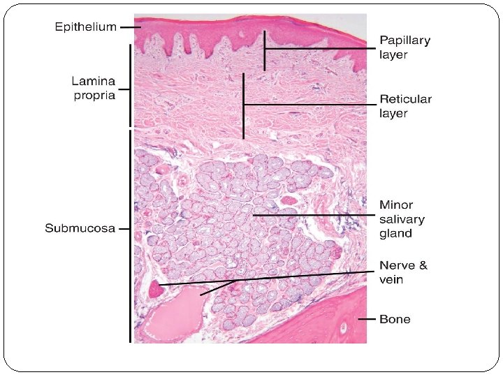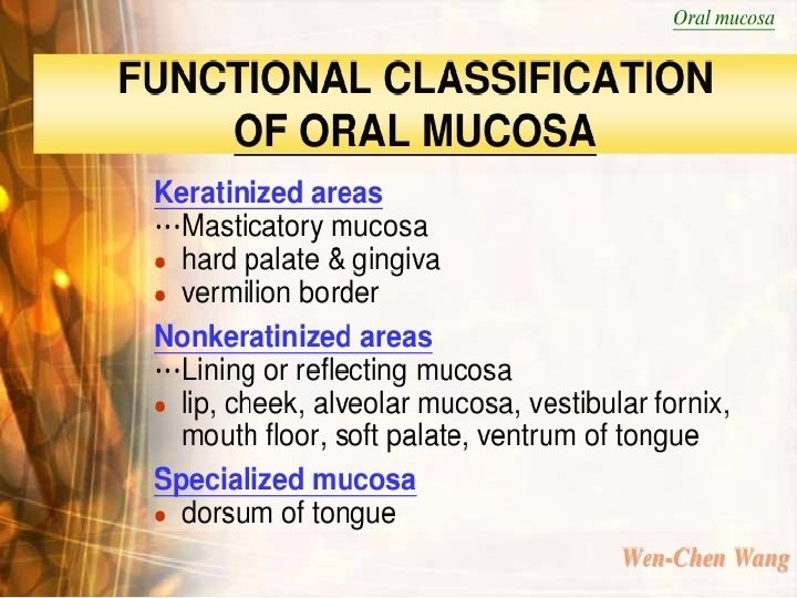 Specialized Lining mucosa Covers the under surface of tongue, floor of mouth, inside of lips & cheeks, alveolar processes and soft palate. Occupies 60% of the oral cavity The Epithelium: - Usually thin but Thicker than that of masticatory mucosa in cheeks. - Non-keratinized in under surface of tongue, floor of mouth, cheeks, alveolar process and soft palate. - Orthokeratinized in vermilion zone and parakeratinized in intermediate zone of lips.