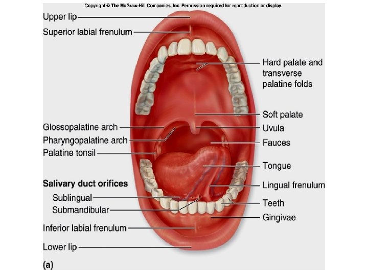 Oral cavity proper It is the cavity interior to the alveolar margins of the maxillae and the mandible when the mouth is closed § Anterior and lateral: It is bounded by the teeth and gums. § Posterior: Limited by the opening into the pharynx (The Oro-Pharyngeal Isthmus) § The Roof is formed by the hard palate anteriorly and the soft palate posteriorly § The Floor is formed by the mylohyoid muscle. § The anterior 2/3 rd of the tongue lies on the floor.