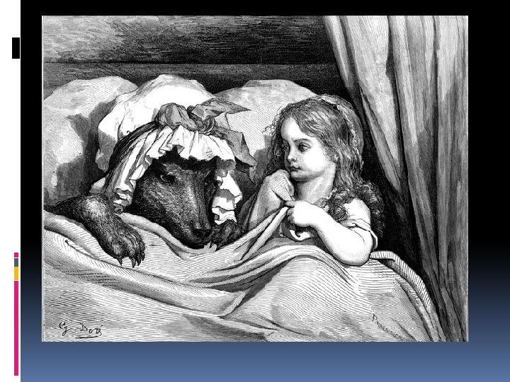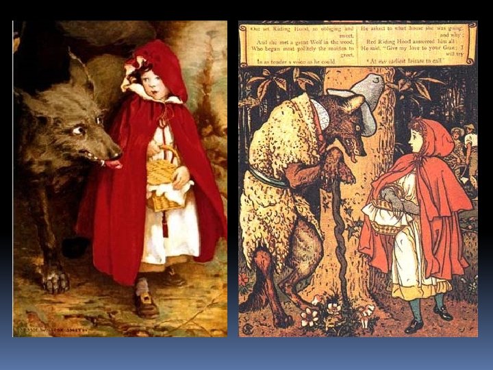 Little Red Riding Hood 1. What’s this story about? Grimm’s? /Perrault’s? 2. What is a/the wolf? Grimm’s? /Perrault’s? 3. What does Red Riding Hood do? What does her grandmother do? What does the wolf do? (Who has agency? ) Grimm’s? /Perrault’s? 4. What do you think about the moral? Grimm’s? /Perrault’s? 5. Is it important that this story have a moral? 6. What other variations have you heard, either old or new?