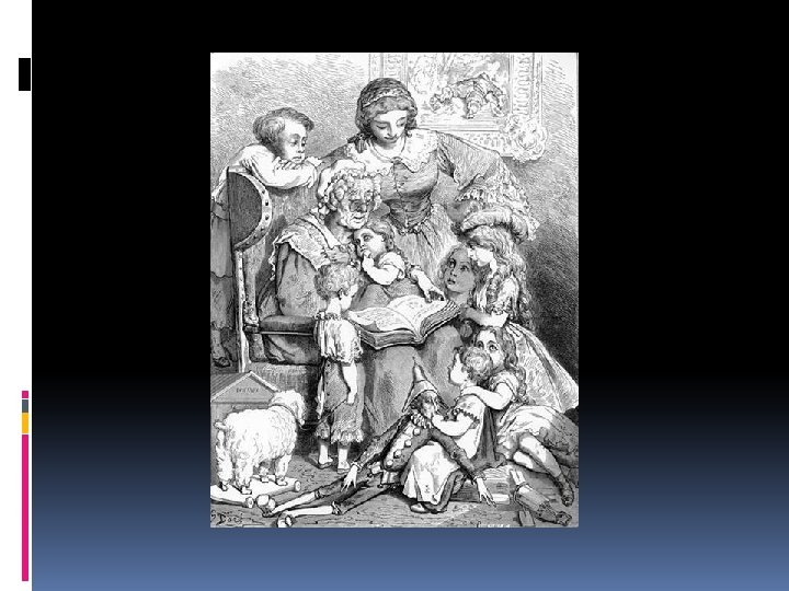 Charles Perrault 1628 -1703 • He’s credited for beginning the literary genre of the folk tale. • A French aristocrat, attended best schools, worked in government and with literature. • He was a major supporter of “the moderns” in a popular debate that pitted ancient literature against modern. • Wrote these stories in his 60’s thinking of his own children. • He added morals • He made many changes such as Cinderella’s glass slipper (unstretchable and see-through) he gave his stories fashionable settings. Whoa! Nice hair!