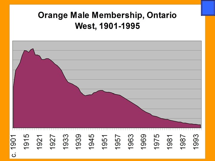 20 th c. International Orange Membership Trends • Ontario declines first, 1920 • Newfoundland Northern Ireland decline after 1960, though faster in NF • Scotland declines from 1982, but from smaller base
