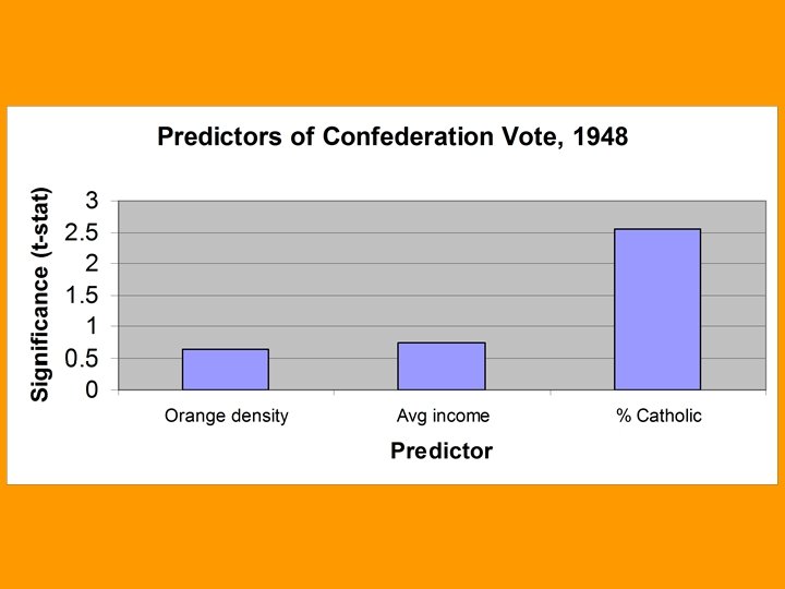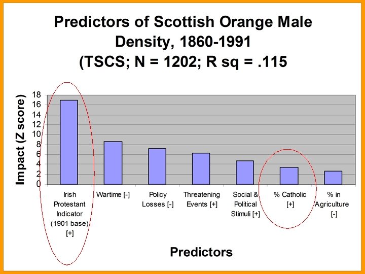 International Orange Strength • Newfoundland the strongest Orange jurisdiction, similar to Ulster border counties • Belfast area and Ontario similar • WC Scotland NW England much weaker