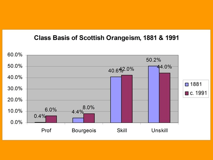 Order 'goes native' in Canada but less so in Scotland • In 1881, 3/4 of 256 lodge masters in Scotland are Irish-born; Thought of as an Irish organisation into the 1930 s • In 1901, just 7% of Ontario sample of 340 masters and few Newfoundland members are Irish-born • Numerical success and class profile higher in Canada • Irish Methodists vastly overrepresented in Ontario: a new world adaptation
