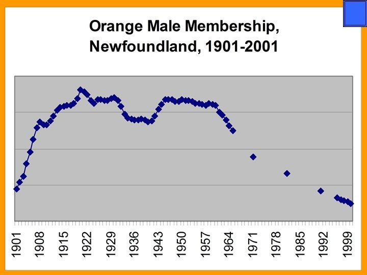 International Orange Similarities • All jurisdictions experience growth until the 1920’s • All decline in the Depression years • All experience growth after World War II • All experience steady decline in recent decades • N. I; Scotland; Ontario; Newfoundland