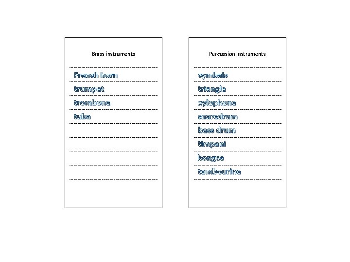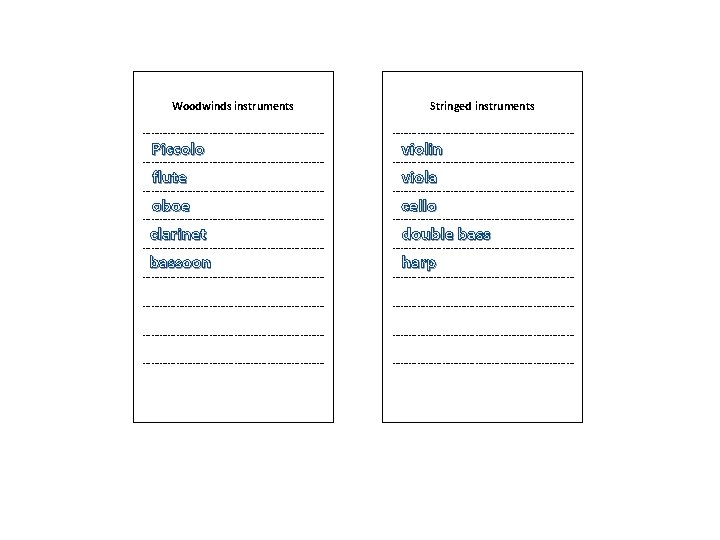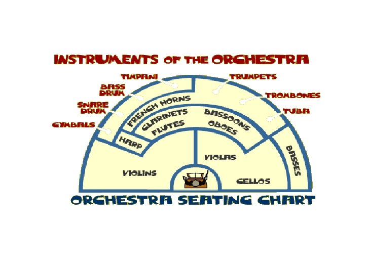The Orchestra An orchestra is a large group of musicians who play together on various instruments. The orchestra is divided into groups or ‘sections’. Each section of the orchestra is set up according to what type of instruments are in it. Usually, the instruments include strings, woodwinds, brass instruments and percussion instruments. Leading this group of musicians is the conductor. 1. The conductor 2. Stringed instruments 3. Woodwinds 4. Brass instruments 5. Percussion instruments 6. Harps