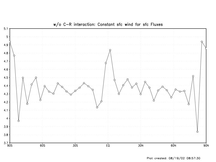 The latitude of the ITCZ in an aqua-planet with uniform SST and solar angle is the latitude where ω2 = 0, where ω2 = f 2 + 2 N 2 + |F|, and is latitude; ω frequency of the inertial gravity wave; α the ratio of vertical scale to horizontal scale of the gravity wave; N 2 vertical stability; |F| a frictional term i. e. , the latitude where f 2/ (= 8 2 sin cos , the first effect of the earth’s rotation) is balanced by ( 2 N 2)/ (the second effect of the earth’s rotation, which is the latitudinal gradient of the f-modified surface heat exchange. ) Note that N 2 is a function of dynamical, radiative, convective, and boundary layer processes.