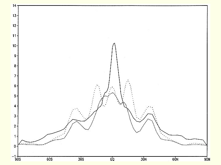 Previous ITCZ theories • Charney (1971) proposed that the latitudinal location of the ITCZ was determined by the balance of two forcings. The first forcing is derived from a zonally symmetric version of the CISK theory. This forcing pulls the ITCZ poleward. The second forcing is the high moisture content of the equatorial tropics, which pulls the ITCZ toward the equator. • Offshoots of the Charney theory include those of Holton et al. (1971), Lindzen (1974), Hess et al. (1993), and Waliser and Somerville (1994), etc.
