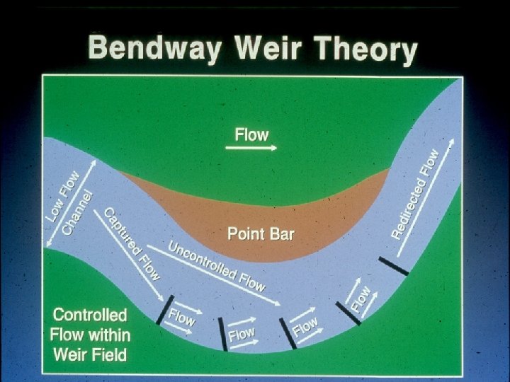 How Do Bendway Weirs Work? w Water flowing over the weir is redirected at an angle perpendicular to the longitudinal axis of the weir. w With weirs angled upstream the erosive flow (energy) is directed away from the outer bank and toward the inner part of the bend. w Strong secondary currents (helical flow) in bend are broken up. w A set of weirs are designed to act as a system to capture, control, and redirect current directions and velocities through the bend and into the downstream crossing. w Last weir in system can aim flow (and channel thalweg) where you need it.