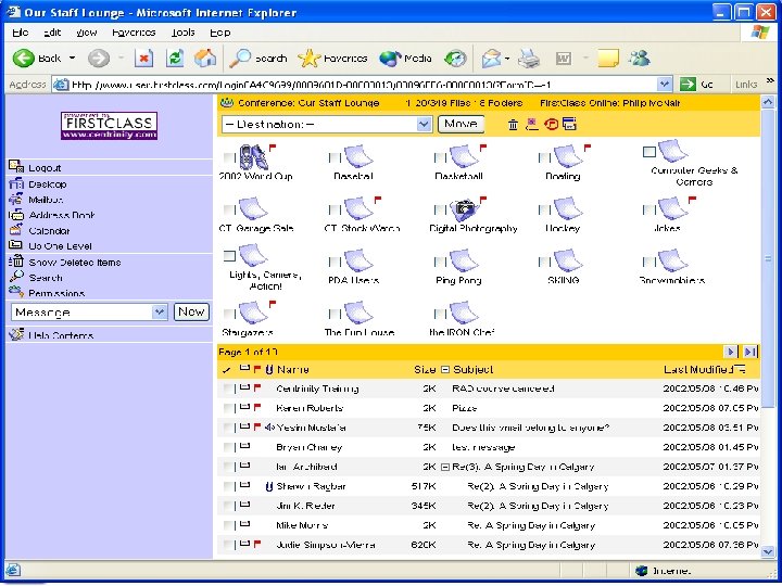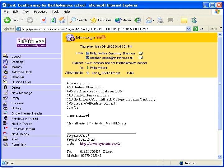 Centrinity First Class… more than just email ! Accessed through the secure portal…. single sign-on ……. benefits to users Students can use OCN mail as a centralised location to: • Obtain and submit homework and assignments • Obtain due dates for assignments and testing dates • Determine school announcements and holiday schedules • Collaborate with students on assignments and projects • Communicate with fellow students and teachers online outside of school hours • Access employment and other community information • Access resources through managed Internet mail lists and newsgroups.