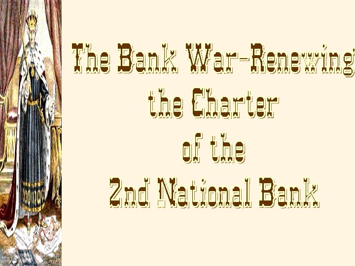 Pros and Cons of the 2 nd B. U. S. Pro Bank 3 3 3 Anti Bank Trusted currency-paper money backed by “specie”. 3 Spurs economy by making currency and credit available 3 Safe depository for Federal funds collected from tariffs and taxes. 3 3 3 Unconstitutional-Jefferson was right. Favors the eastern financial and manufacturing elite. Does nothing for the South and West except foreclose on farms. Bank 4/5 privately owned. Private investors making profit on public $. Responsible for Panic of 1819.