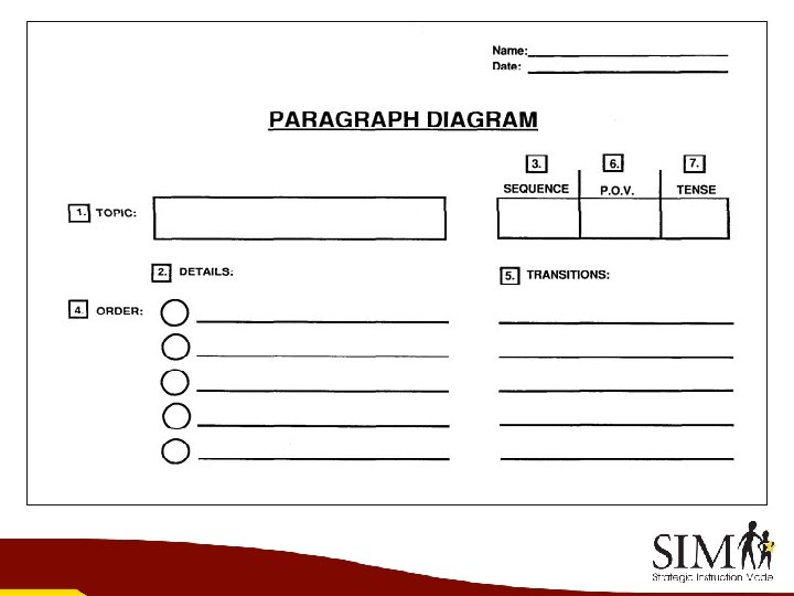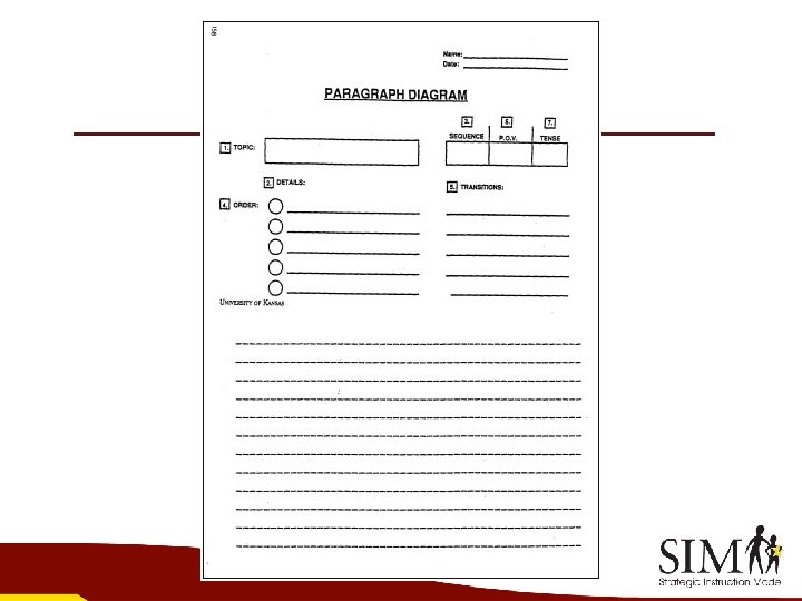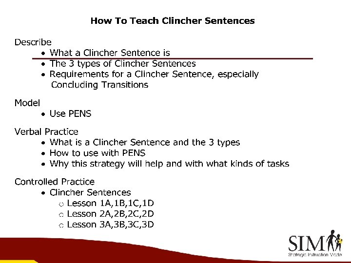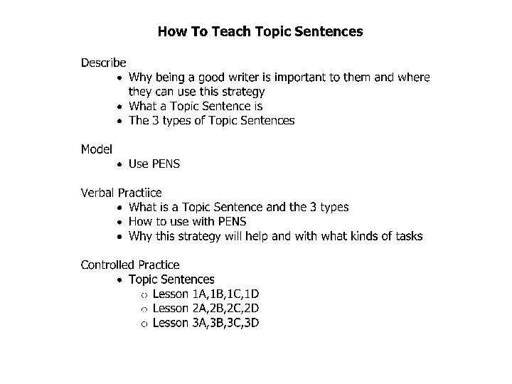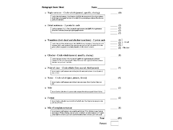 The purpose of the strategy instruction To teach students to write wellorganized paragraphs that include: – Topic, Detail, and Clincher Sentences – a consistent point of view – consistency in tense throughout – logically sequenced ideas – appropriate transitions between ideas