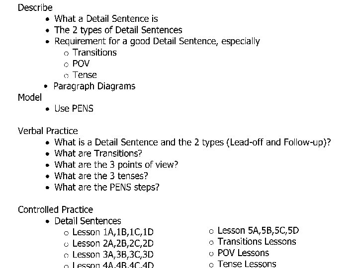 Teaching Detail Sentences PWS Student Lessons: pages_______. The worksheets are _____. There are ____ worksheets for each type of worksheet. They are labeled ______. Mastery is ____%. Once students master a worksheet, do ______ have the students continue at that level. It is _______. PWS Instructor’s Manual: Pages______ Cue Cards_______ Stage Describe Model Verbal Rehearsal Controlled Practice Purpose Teacher’s Behavior Student Behavior