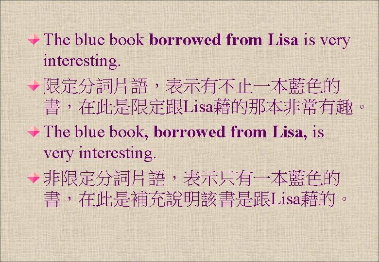 How to reduce clauses to participial phrases- 1 3. Her brother, who lives in Taipei, will be back home next Sunday. -> Her brother, ( living in Taipei ), will be back home next Sunday. 非限定的形容詞子句改成分詞片語,此片語在句 中,所以兩個逗點需保留。 此片語補充說明 Her brother,可見弟弟只有一 個,所以沒有限定是哪一個。