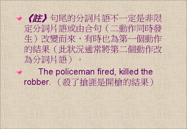 3. 舞會過後,他就開車回家了。 The party being over, he drove back home. 4. Peter走了,留下來一堆債務。 Peter left, leaving lots of debts. 5. 看見媽媽小男孩就哭了。 Seeing his mother, the little boy cried. 6. 這些人突然靜下來,他們怕得發抖 These people, trembling with fear, became silent all of a sudden.