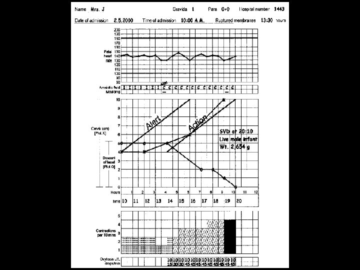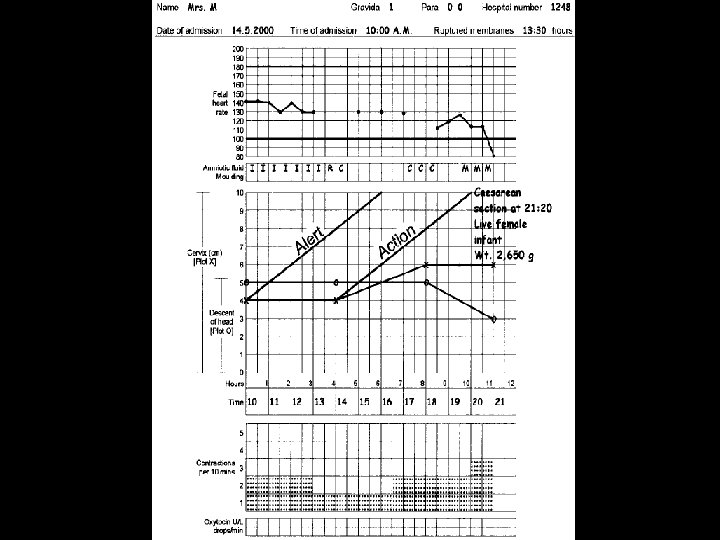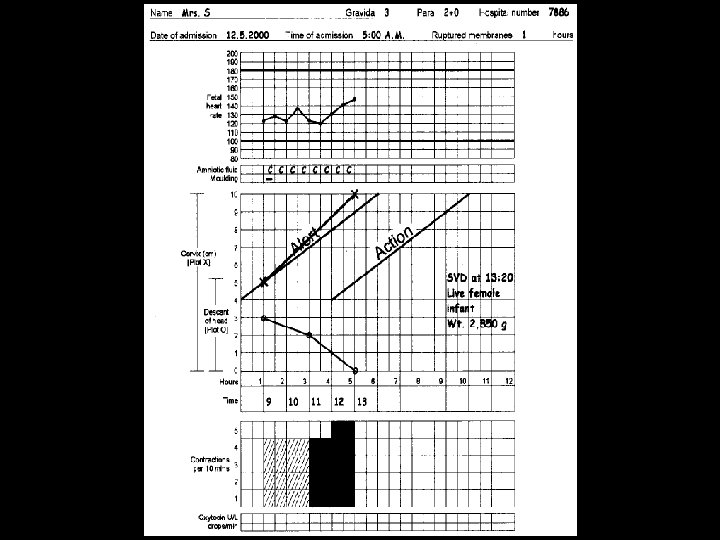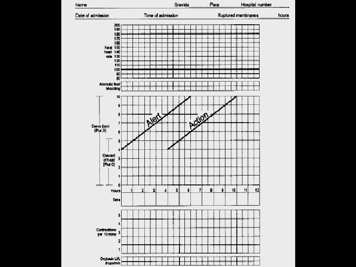 Cervical dilatation Action Line: • If the action line is crossed the actions should be as follows in mentioned order (if not already performed) • ARM and oxytocin augmentation • Correction of malposition • Cesarean Section or Vacuum (if in second stage and descend is 1/5 or below)