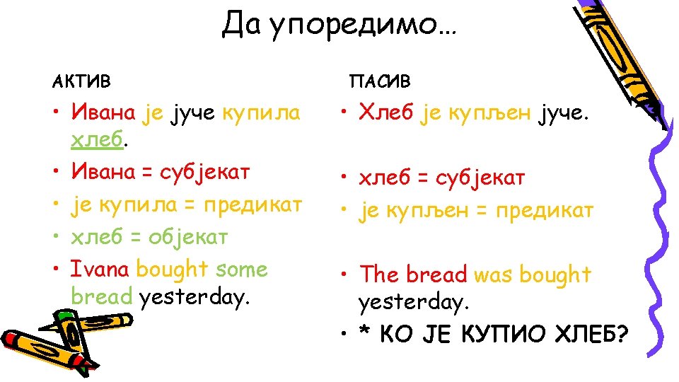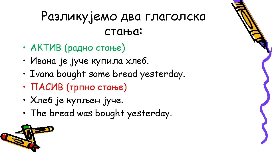 Vežbanja za Present Simple Passive • 1. Flowers (water) _______ every day and old leaves (cut) ______. • 2. I (not invite) ____ to the party. • 3. The city streets (clean) _______ at night. • 1. are watered, are cut • 2. am not invited • 3. are cleaned