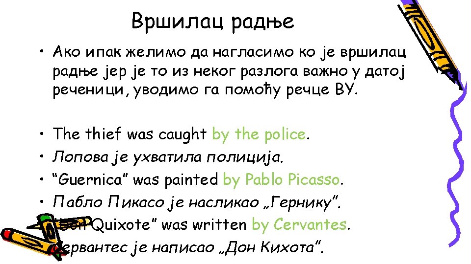 Present Perfect Passive • HAVE BEEN + particip prošli (treća kolona ili nastavak –ed ako je glagol pravilan) • The thieves have been caught by the police. • Harley-Davidsons have been used by the army. • Some wonderful roses have been brought in by Marianne.