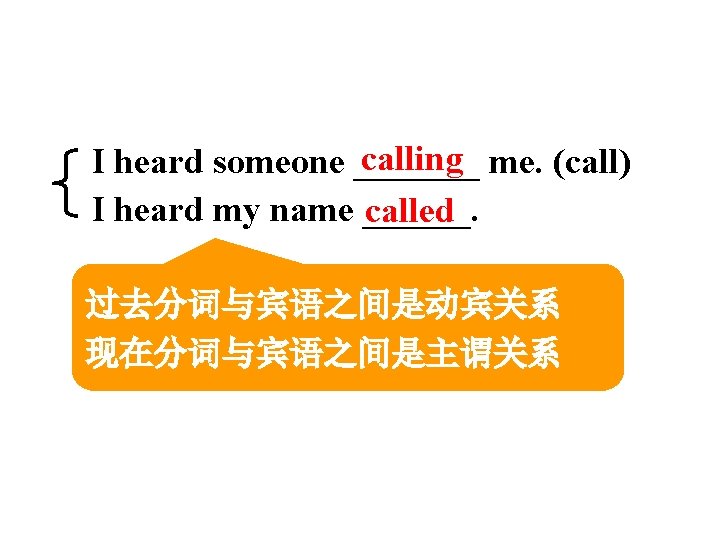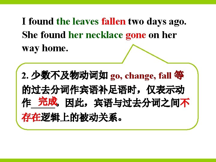 The relationship between the object and the past participle He got his bad tooth pulled out yesterday. He found his new bike stolen. 1. 及物动词(短语)的过去分词用作宾补时,宾 语即是过去分词的逻辑宾语,宾语和过去分词 被动 之间存在逻辑上的 _____ 关系。