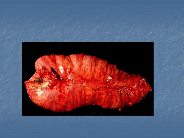 Mural & Mucosal Infarction: n n n In any level of the gut from the stomach to anus lesions may be multifocal-scattered or continuouswidely distributed (depends on the level of the arterial narrowing), does not affect the entire thickness (may not be visible from the serosal surface), on opening the bowel, there is hemorrhagic, edematous thickening of the mucosa. Superficial ulcerations with edema, n hemorrhage, n fibrinous inflammation (psedomembrane due to superinfection). n