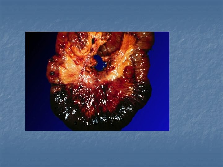 Morphology Transmural Infarction: n n Sudden and total occlusion of mesenteric arterial blood intestinal infarction. Arterial or venous occlusion hemorrhagic infarct, ischemic injury mucosal necrosis 18 -24 h fibrinous exudate over the serosa Margins of the infarct: in arterial occlusions : distinct (demarcation) n in venous occlusions : less distinct n n n Microscopy: edema, interstitial hemorrhage, necrosis (24 h) gangrene perforation peritonitis !!!