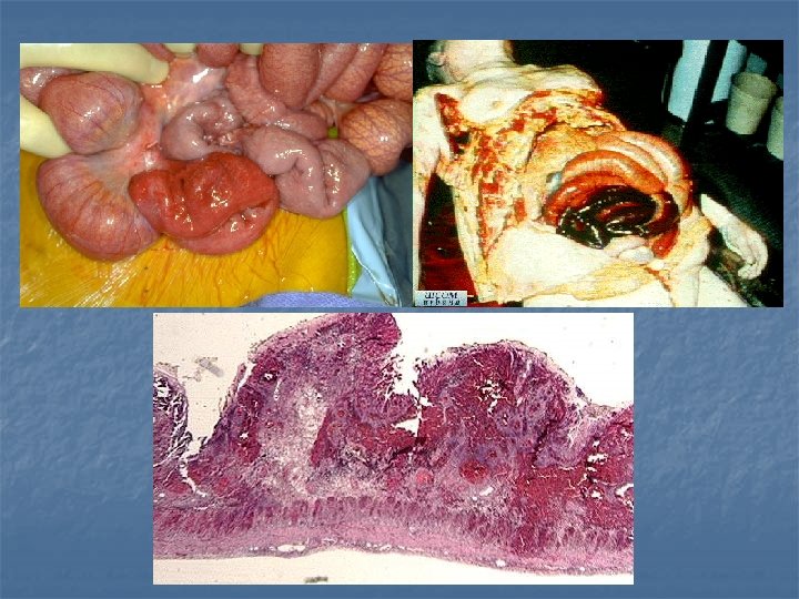 n In early phases, the mucosa exhibits n n As the disease progresses, the full thickness of the bowel wall becomes n n n edema, hemorrhage, necrosis hemorrhagic, inflamed, gangrenous frank intraluminal hemorrhage mural gas formation Reparative changes n n n epithelial regeneration granulation tissue formation fibrosis.