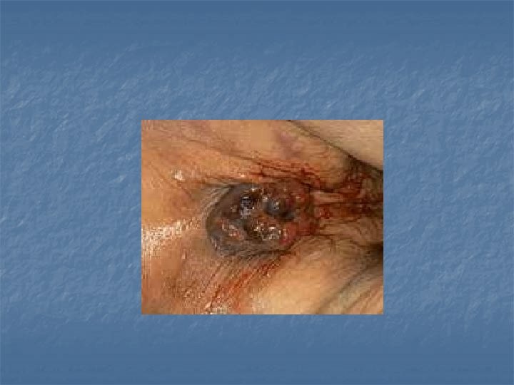 Hemorrhoids n n n Variceal dilatations of the anal and perianal venous plexuses Persitently elevated venous pressure within the hemorrhoidal plexus Predispositions: chronic constipation, n pregnancy. n n n Thin-walled, dilated vessels Complications: Bleeding, prolapsing.