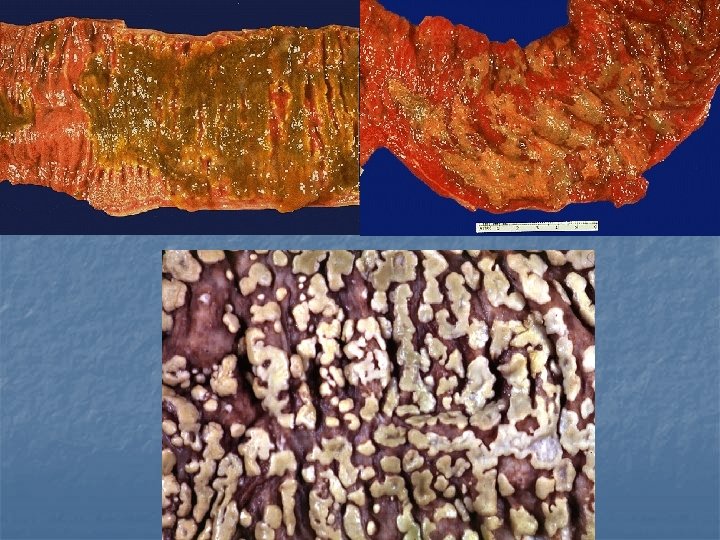 Antibiotic-Associated Colitis (Pseudomembranous Colitis) n n n C. difficile (a normal gut commensal) acute colitis plaque-like adhesion of fibrinopurulent-necrotic debris and mucus to damaged colonic mucosa