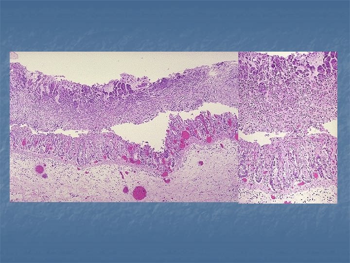 n Most bacterial infections exhibit a general nonspecific pattern: damage of the surface epithelium n decreased epithelial cell maturation n an increased mitotic rate (“regenerative change”) n hyperemia and edema of the lamina propria n variable neutrophilic infiltration into the lamina propria and epithelial layer. n