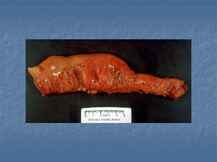 Necrotizing Enterocolitis Neonates (premature or of low birth weight) n acute, necrotizing inflammation. n A combination of n n ischemic injury, colonization by pathogenic organisms, excess protein substrate in the intestinal lumen, functional immaturity of the neonatal gut.
