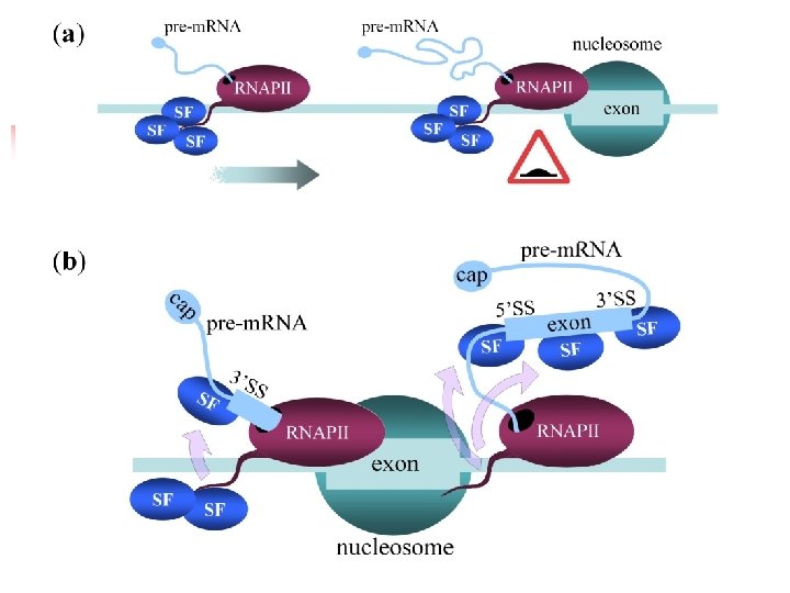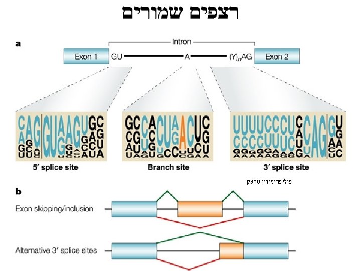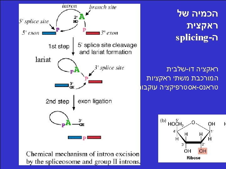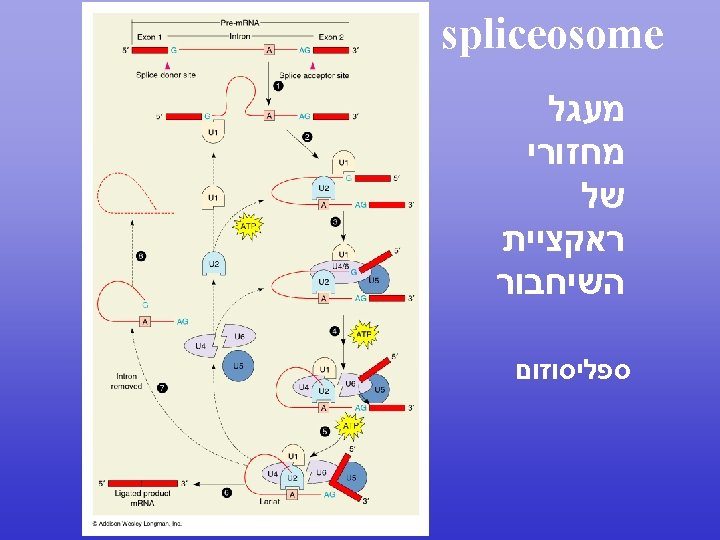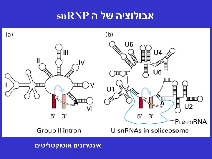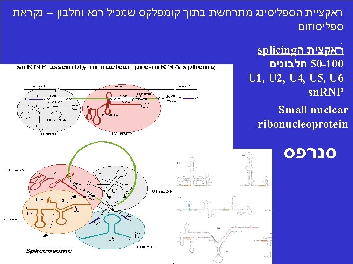 Pre-m. RNA splicing involves 5 small nuclear RNAs (sn. RNAs) U 5 U 1 חוט השידרה של ראקציית הספליסינג הינה הדרך בה חמשת המולקולות של הרנא עוברות אינטראקציה אחת עם השניה ועם הרצפים השמורים על מנת לאפשר את ראקציית . הספליסינג U 2 U 6 U 4 orange-interaction with the 5’ splice site green-interaction with the branch site blue-interaction between U 2 and U 6 tan-Sm-binding site (Pu. AU 4 -6 GPu) flanked by two stem-loop structures