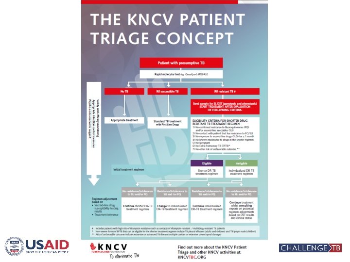 Patient Triage Concept: Right diagnosis, Right treatment 1. Rapid molecular tests for TB and resistance (FLD and SLD) 2. Early initiation of effective regimens for rifampicin-resistant (RR) TB patients: • Shorter regimens for RR-TB patients without o Risk or confirmed resistance to key SLD and/or o Intolerance to key SLD • Regimens containing new drugs for RR-TB patients with o Risk or confirmed resistance to key SLD o Intolerance to key SLD o Severe TB disease
