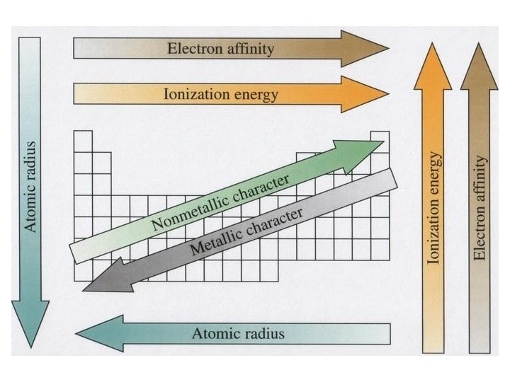 Periodic Properties’ Trends • Electron affinity = energy change accompanying acquisition of electrons by neutral atoms. § Most atoms release energy when get electron. o Released energy is noted as a negative value. Ø A + e- A- + energy F has the highest value of -339. 9. o Positive or less negative values indicate atom was “forced” to get electron, i. e. , energy was absorbed. o Most atoms so forced will spontaneously lose electron. Ø A + e- + energy A- Values are often listed as “(0)”.