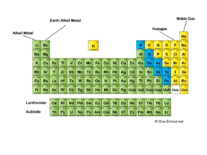 Additions to Periodic Table • Noble gases – 1894: Ar; 1895: He; 1898: Kr & Xe; 1900 Rn • Lanthanides – Early 1900 s – Very similar in chemical & physical properties – Soft and shiny; reactivity like alkaline-earth metals • Actinides – All are radioactive; 1 st 4 are natural, rest synthetic – Those after uranium are “transuranium elements”.