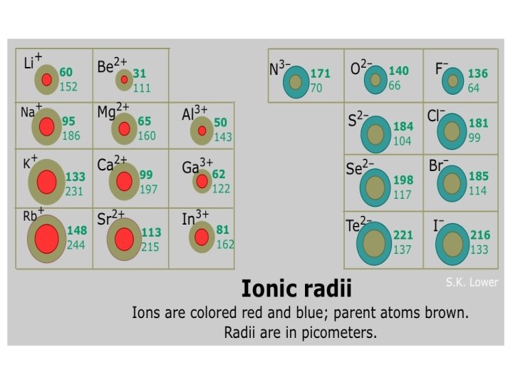 Periodic Properties’ Trends • Atomic & ionic radii: as go left & down – Across the period, nuclear charge increases. • As the positive charge increases, electrons are pulled in more tightly, thereby the radius. – Down the group, the # of energy levels increase. • Cations have smaller ionic radii than the atom. – When the valence electron shell is lost, the ion is smaller • Anions have larger ionic radii than the atom. – Extra electrons do not compact as readily, mostly because of their electrostatic repulsion for each other.