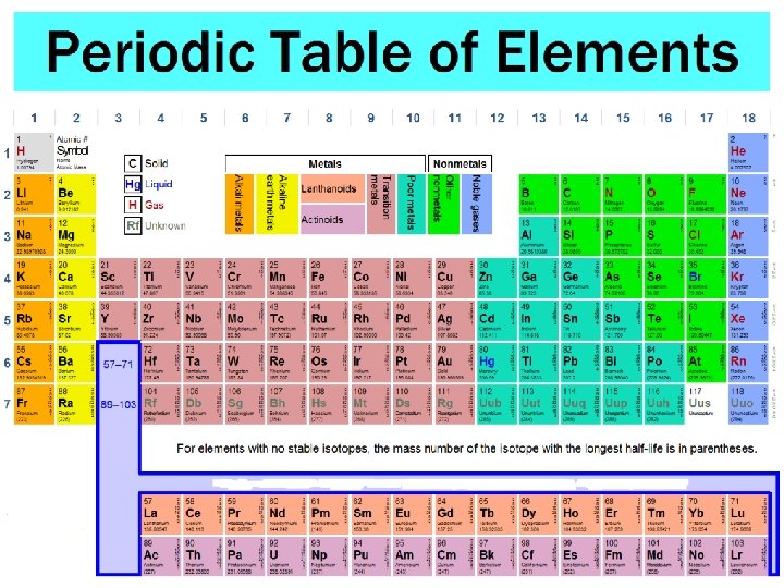 Henry Moseley (1887 – 1915) – English Physicist Ø developed idea of atomic number Øused x-rays to determine the atomic number of elements Øcorrected Mendeleev’s table by arranging elements according to atomic number, not atomic mass Øfounded modern periodic law: when elements are arranged in order of increasing atomic number, their physical and chemical properties show a periodic pattern